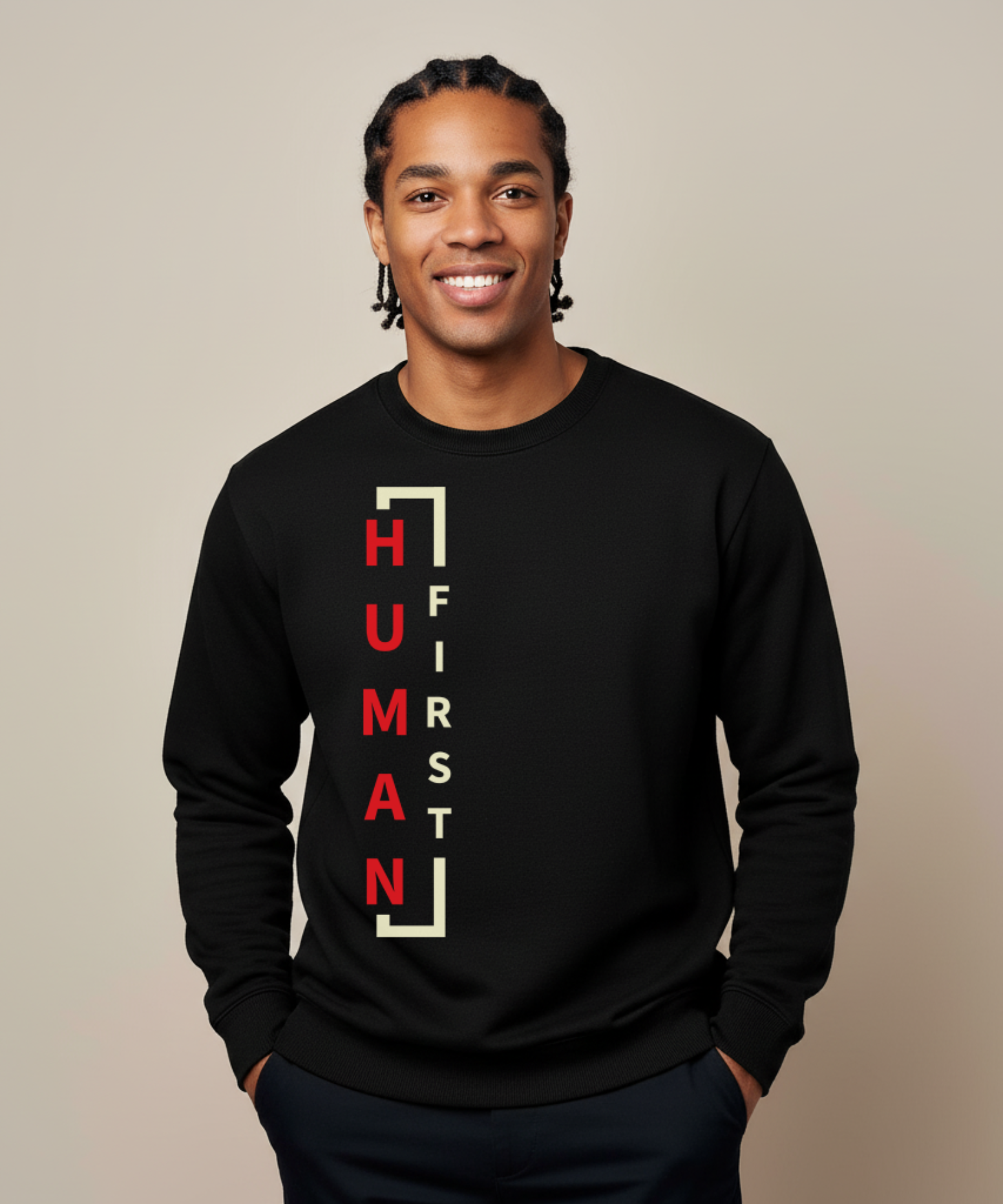 Crafted with premium quality apparel, this unisex crewneck offers a modern fit, soft fleece interior, and lasting comfort. The bold vertical “HUMAN FIRST” design is printed to inspire conversation and connection wherever you go.